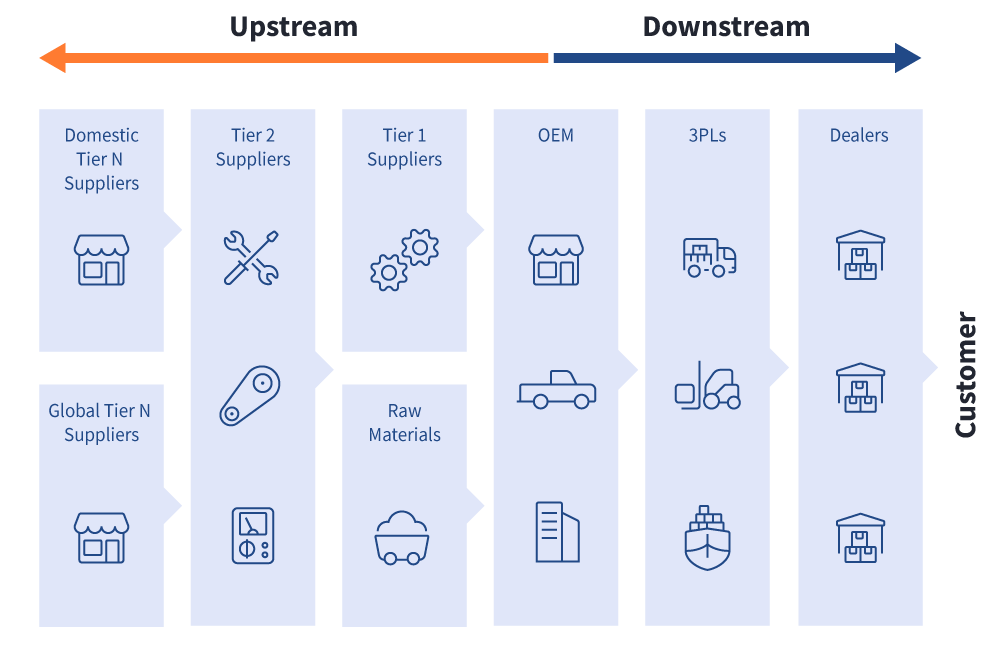 L'industrie automobile a une structure de chaîne d'approvisionnement « à plusieurs niveaux », que le diagramme ci-dessous illustre parfaitement. En amont du constructeur automobile ou du fabricant d'équipement d'origine (OEM), on trouve les fournisseurs de niveau 1. Ces entreprises fournissent généralement certains des plus gros composants ou sous-systèmes des voitures, comme un ensemble de suspension ou une boîte de vitesses. En remontant la chaîne de valeur, les fournisseurs de niveau 2 fournissent généralement des composants aux fournisseurs de niveau 1, qui peuvent être des groupes motopompes, des moteurs électriques ou des ensembles de roulements. Ensuite, plus en amont, on trouve les fournisseurs de niveau 3-x qui fournissent aux fournisseurs de niveau 2 tout ce dont ils ont besoin, des supports et joints aux composants usinés, etc.