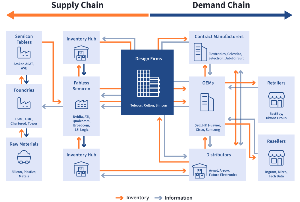 Une fois fabriqués, ces produits sont expédiés par des distributeurs spécialisés de haute technologie tels qu'Avnet et Arrow vers les installations d'entreposage et de distribution du fabricant d'origine avant d'être finalement acheminés vers les détaillants ou les revendeurs. Le schéma ci-dessous illustre les flux de stocks et d'informations tout au long de la chaîne de valeur des hautes technologies.