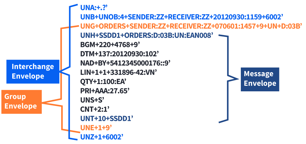 Ein Umschlag besteht aus einem Paar von Segmenten, die den Anfang und das Ende des entsprechenden Abschnitts definieren. Wenn Sie den EDIFACT-Standard als Beispiel nehmen, verwendet der Transaction Set Envelope die Segmente UNH und UNT, der Group Envelope die Segmente UNG und UNE und der Interchange Envelope die Segmente UNA/UNB und UNZ. In jedem Fall steht das "S" für den "Anfang" der Hüllkurve und das "E" für das "Ende" der Hüllkurve. Das folgende Diagramm veranschaulicht die drei Ebenen von Umschlägen, die eine einzelne EDI-Bestellung umgeben würden.