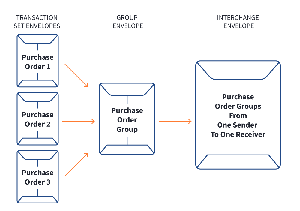 Bei der Übertragung von EDI-Dokumenten werden drei "Umschläge" für Ihre Transaktionssätze verwendet: Nachrichtenumschlag, Gruppenumschlag und Austauschumschlag.
