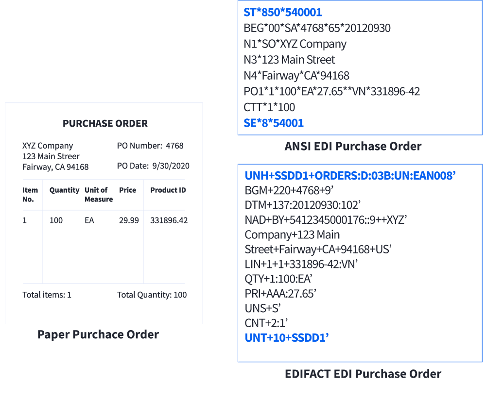 Die folgende Grafik zeigt eine Musterbestellung in gedruckter Form und wie sie aussehen würde, wenn sie in die EDI-Formate ANSI und EDIFACT übersetzt würde.
